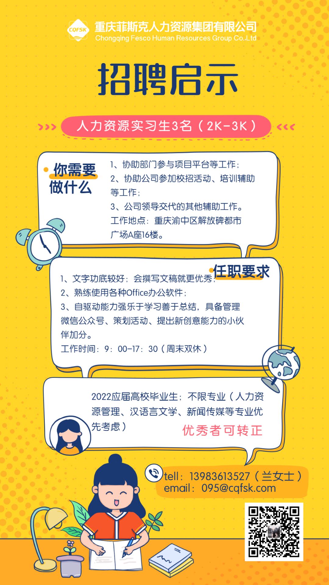 重庆菲斯克人力资源集团有限公司招聘人力资源实习生3名
