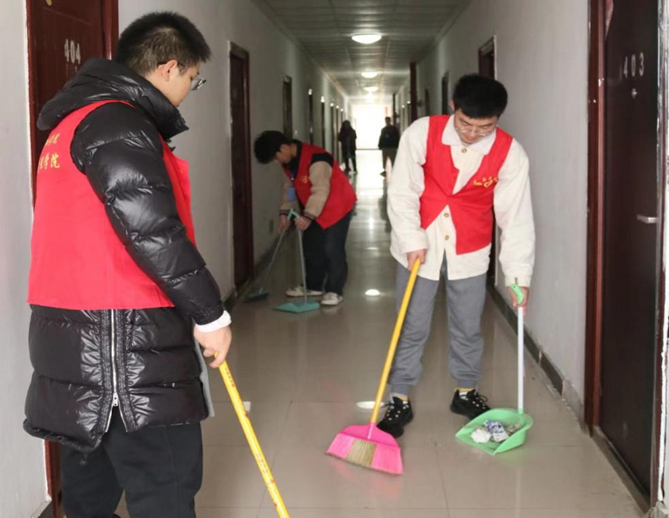 紧接着,志愿者们身穿红马甲,携带扫帚与簸箕,分为三个小组分别前往桂花苑与榕叶苑寝室楼开展志愿活动,每小组的志愿者依次有序地对寝室楼道、走廊以及寝室楼外的环境卫生进行打扫清洁。
