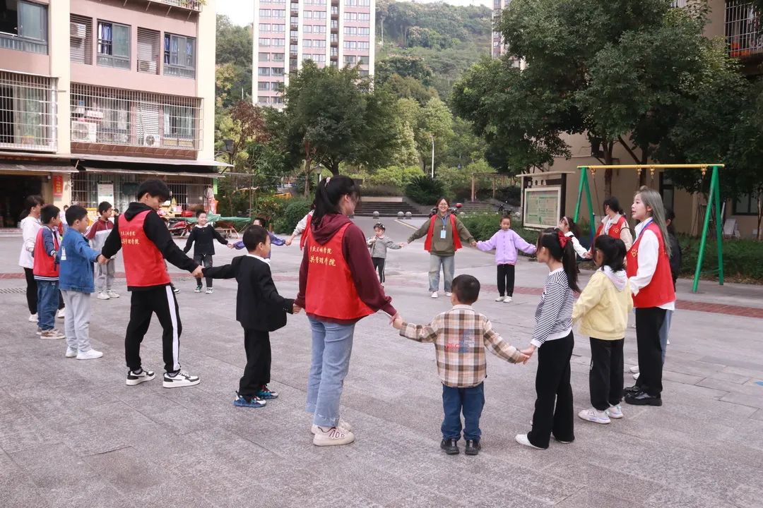 最后志愿者与小朋友们一起跳彝族的火把舞,并在室外进行"抱团"、"击鼓传花"等小游戏。