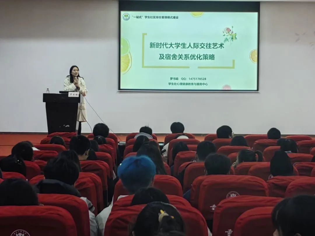 2023年12月3日下午,太阳成集团tyc33455在明辨楼2栋104室开展了“新时代大学生人际交往艺术及宿舍关系优化策略”心理健康讲座。讲座由学生处心理健康中心罗书晗老师主讲,2023级全体新生和其他年级部分同学参与。
