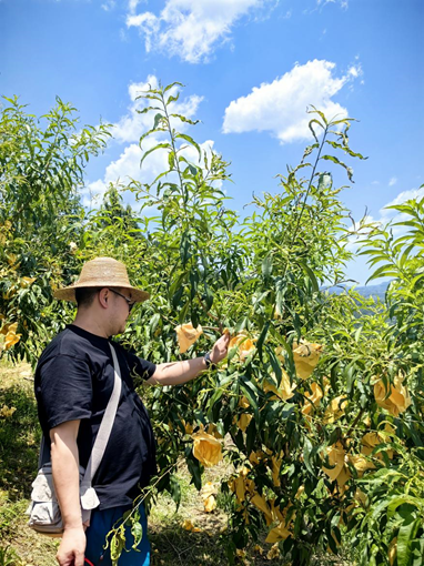 戴上草帽、拎起果篮,30余名党员在农户指导下化身“采摘能手”。教工党支部组织委员田晓波带着大家穿梭于果树间,边示范边强调:“大家摘果的时候一定要轻握果柄旋转,千万不能硬拽伤了树枝!”烈日炎炎,却比不过党员们采摘的干劲和热情,在众人的密切配合下,黄桃顺利完成采收。博士党员李霞感慨:“指尖沾满桃胶时才真正懂得‘粒粒皆辛苦’,这比任何说教都深刻。”