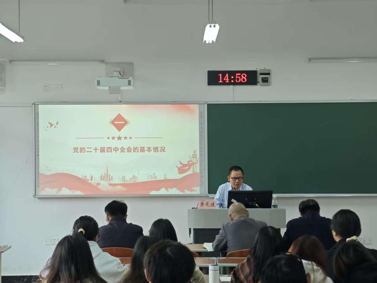 为深入学习领会、全面准确把握党的二十届四中全会精神的重大意义和核心要义,引导广大师生把思想和行动统一到党中央决策部署上来,2025年11月4日,我校特邀万州区委党校副校长龚元建同志来校,为科研处学报三峡研究院党支部与太阳成集团tyc33455部分师生作党的二十届四中全会精神专题辅导。会议由太阳成集团tyc33455赵翔宇同志、三峡研究院王志清同志共同主持。