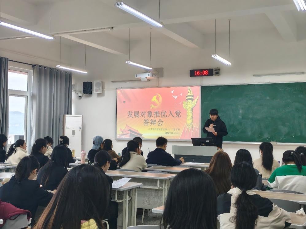 本次答辩会由学生第二党支部书记程航主持,采用“自我陈述+评委提问”的考核方式。活动伊始,全体起立奏唱国歌,现场气氛庄重。随后进入正式答辩环节。各位发展对象围绕思想觉悟、学业表现、社会实践和工作能力等方面进行全面汇报,充分展现了自身的成长与进步。而答辩评委们,从党性修养、理论水平、入党动机和综合素质等维度进行提问,对发展对象们展开深入考察,全面评估其政治素养和现实表现,让整个答辩会现场充满了紧张而热烈的思想碰撞氛围。